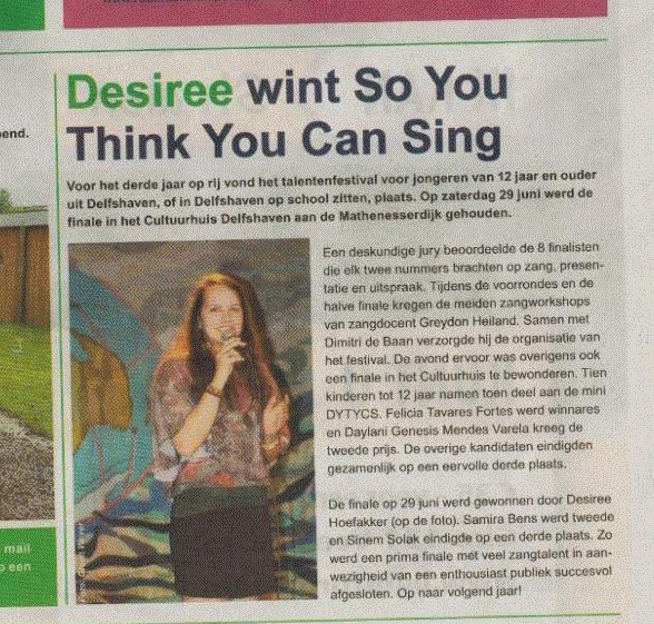Op 29 juni 2013 was de feestelijke afsluiting van Do You Think You Can Sing? 2013. Een serie zangworkshops onder leiding van Dimitri de Baan en Naylan Heiland. Desiree Hoefakker heeft dit jaar met haar stem en presentatie de jury zo omver geblazen, dat zij deze editie van de talentenjacht heeft gewonnen.Samira Bens eindigde op de tweede plek en Sinem Solak kreeg de eervolle derde prijs in handen. De voorbereidingen voor een nieuwe serie workshops in 2014 is in volle gang.